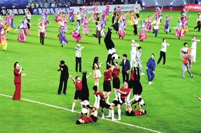 中场休息时,绵阳与德阳两地歌手联袂带来歌曲《超越梦想》,四川籍实力唱将黄英领唱《我和我的祖国》,球迷纷纷加入合唱。