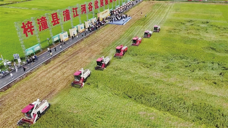 在梓潼潼江河谷优质粮油现代农业园区,联合收割机在稻田里来回穿梭,切割、脱粒、筛选等工序一气呵成。