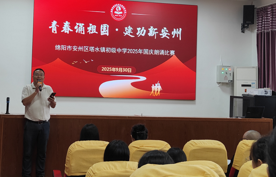 绵阳新闻网讯 9月30日上午,安州区塔水镇初级中学大会议室内举行了以“青春诵祖国,奋进新时代”为主题的国庆朗诵比赛活动,全校师生以诗为媒,共庆中华人民共和国成立76周年。