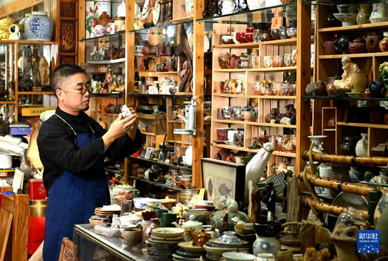 10月11日,在位于河北省石家庄市桥西区的工作室内,李军航在检查残破瓷器情况。