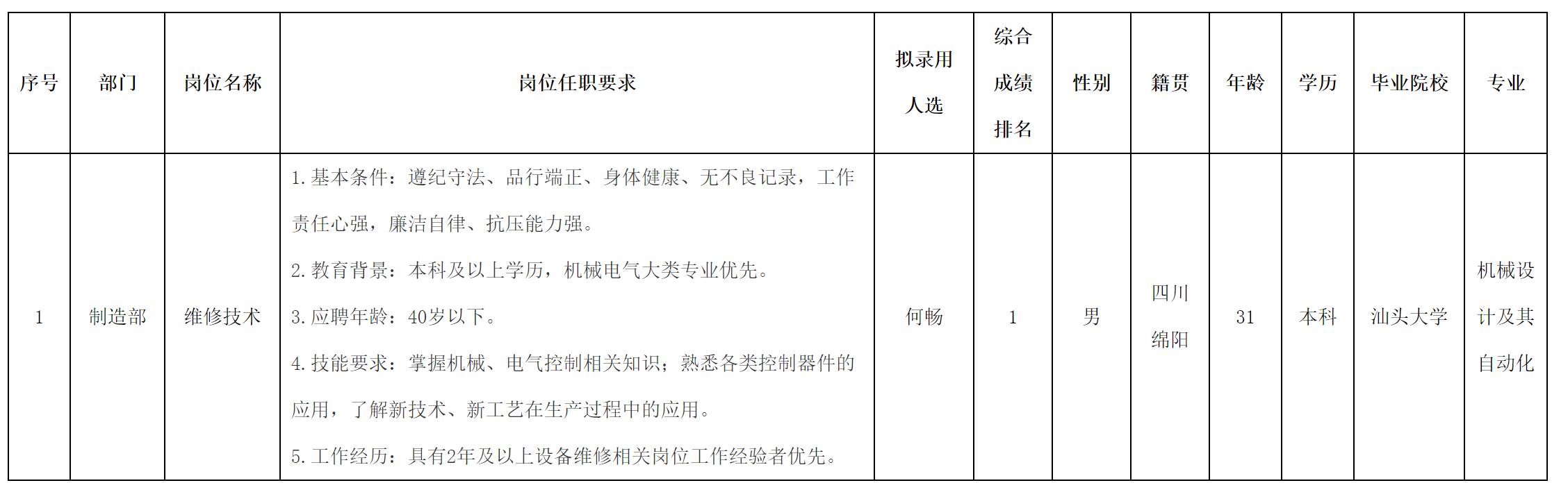 根据四川长虹空调有限公司发布的招聘公告及招聘相关规定,经测试,拟录用何畅到长虹空调制造部工作,现予以公示,具体情况如下:
