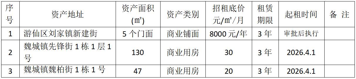 绵阳农村商业银行股份有限公司将对3处优质资产进行公开招租: