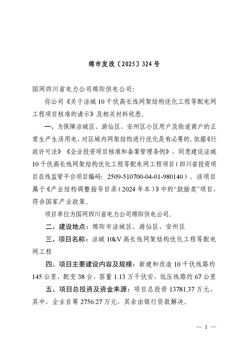 绵阳市发展和改革委员会关于涪城10千伏高长线网架结构优化工程等配电网工程项目核准的批复