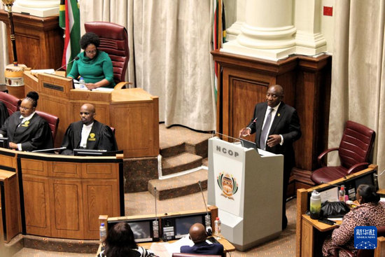 10月14日,在南非开普敦,南非总统拉马福萨在南非全国省级事务委员会(即议会上院)回答议员提问。新华社发(沙姬拉·泰比 摄)