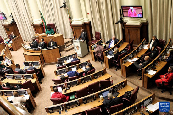 10月14日,在南非开普敦,南非总统拉马福萨(右二)在南非全国省级事务委员会(即议会上院)回答议员提问。新华社发(沙姬拉·泰比 摄)