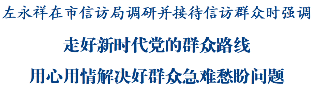 来到市信访局,左永祥走进人民群众来访接待中心,听取全市信访工作情况汇报,察看中心运行情况,详细了解群众来访接待、事项办理等具体流程,并与工作人员亲切交谈,叮嘱大家要始终站稳群众立场,把群众当家人、把群众事当家事,真实了解把握群众所思所想所忧所盼,解决好群众合理诉求;要求中心加强资源整合,优化工作机制,推动政策完善、作风转变、效能提升,更好地为群众服务。随后,左永祥来到接访室,认真倾听群众反映的问题,询问有关情况,现场分析问题症结、研究解决方案,耐心细致为群众答疑解惑,要求有关方面加强统筹联动,强化跟踪督办,依法依规推动问题限期解决;同时坚持举一反三,排查化解共性问题,努力做到以“一件事”带动“一类事”解决,更好维护人民群众合法权益。