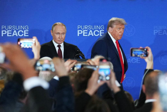 8月15日,美国总统特朗普(后右)与俄罗斯总统普京(后左)在美国阿拉斯加州安克雷奇市埃尔门多夫-理查森联合军事基地举行会晤后共同出席联合记者会。新华社记者吴晓凌摄