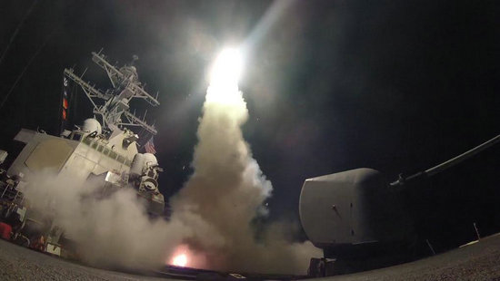 2017年4月7日,美国海军舰船在地中海发射一枚“战斧”导弹。新华社发(美国海军供图)