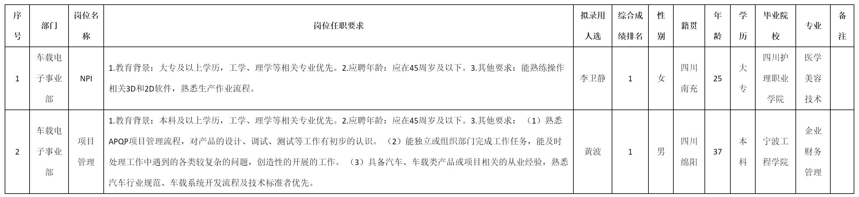根据四川九州电子科技股份有限公司发布的招聘公告及招聘相关规定,经测试、考察、体检等程序,拟录用李卫静等2名同志到四川九州电子科技股份有限公司工作,现予以公示,具体情况如下: