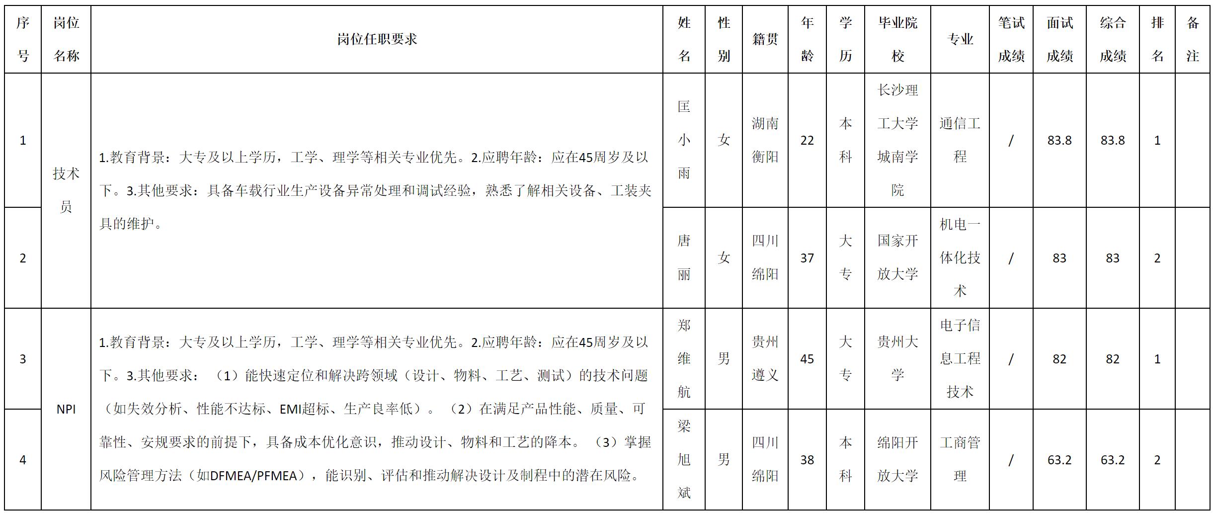 四川九州电子科技股份有限公司关于招聘技术员等岗位测试成绩的公示