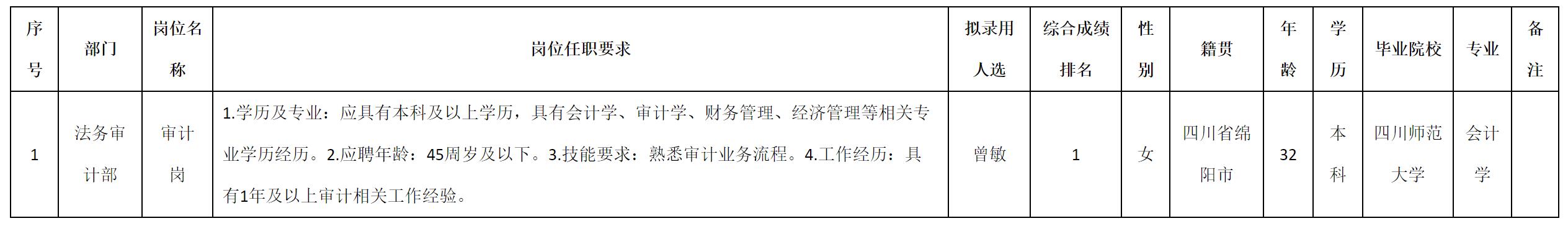 根据四川九州光电子技术有限公司发布的招聘公告及招聘相关规定,经测试、考察、体检等程序,拟录用曾敏同志到四川九州光电子技术有限公司工作,现予以公示,具体情况如下: