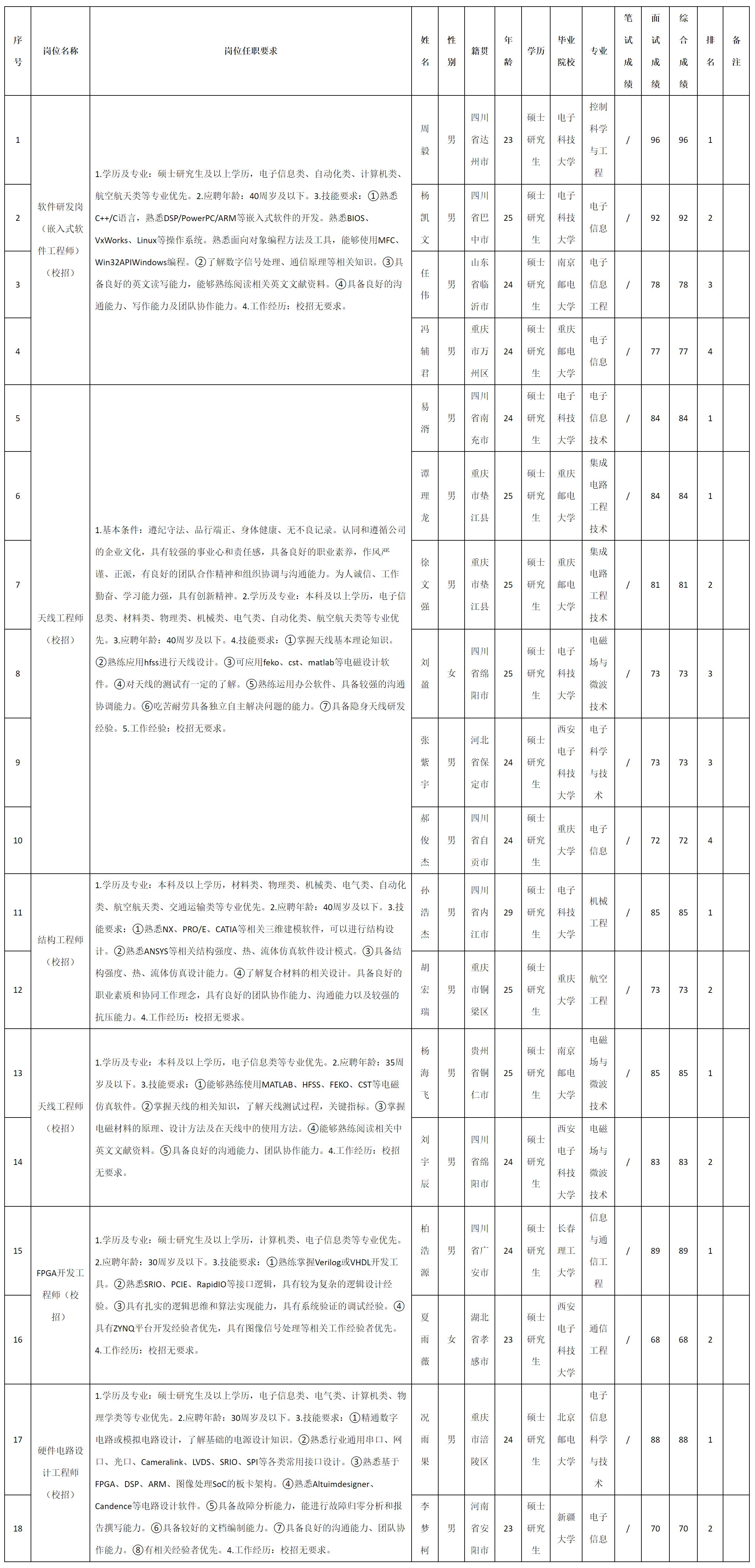 根据四川九洲电器集团有限责任公司发布的招聘公告及招聘相关规定,现将测试成绩予以公示。