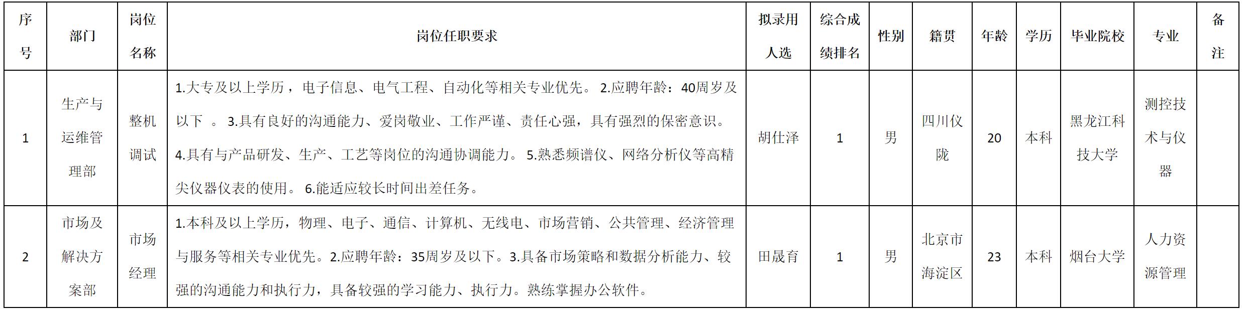 根据四川九洲防控科技有限责任公司发布的招聘公告及招聘相关规定,经测试、考察、体检等程序,拟录用胡仕泽等2名同志到四川九洲防控科技有限责任公司工作,现予以公示,具体情况如下: