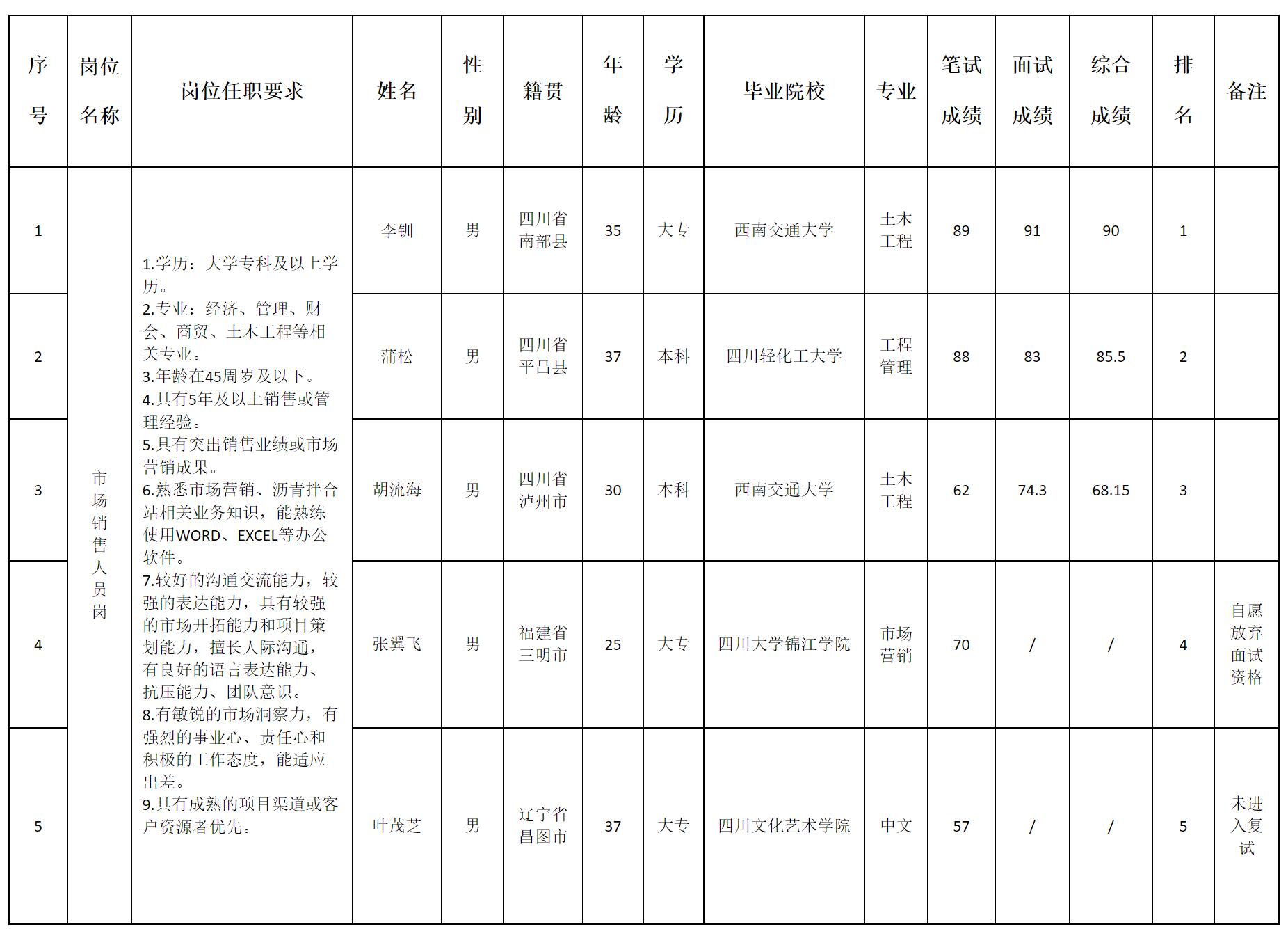 根据绵阳交发大道新材料科技有限责任公司发布的招聘公告及招聘相关规定,经笔试、面试等程序,现将成绩予以公示。