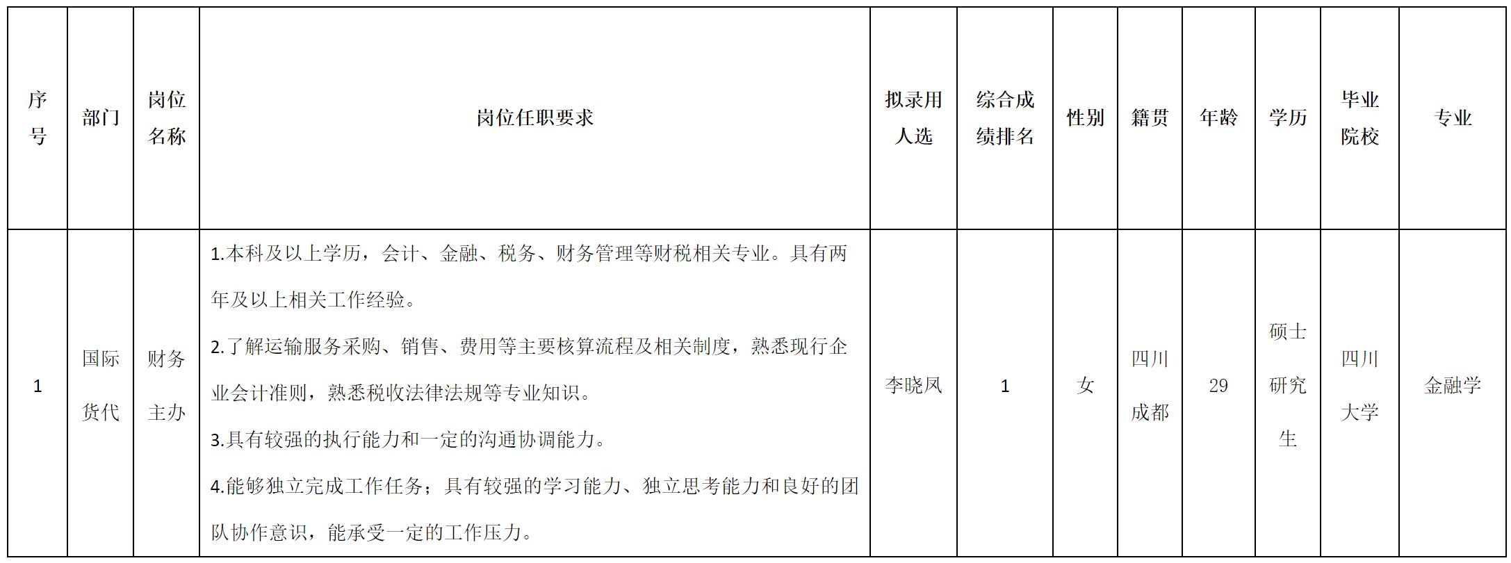 根据四川长虹民生物流股份有限公司发布的招聘公告及招聘相关规定,经面试、考察、体检等程序,拟录用李晓凤同志到四川长虹民生物流股份有限公司工作,现予以公示,具体情况如下: