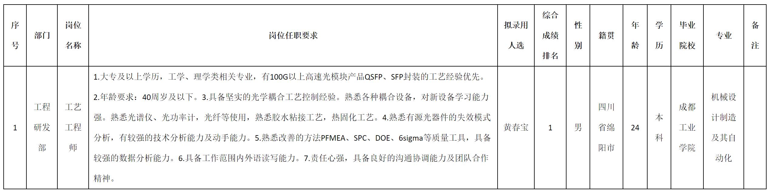 根据四川九华光子通信技术有限公司发布的招聘公告及招聘相关规定,经测试、考察、体检等程序,拟录用黄春宝同志到四川九华光子通信技术有限公司工作,现予以公示,具体情况如下: