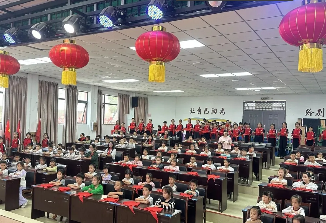 仪式在激昂奋进的出旗曲中拉开序幕。旗手们迈着坚定有力的步伐,高擎少先队队旗入场。全体同学肃立注目,展现了新时代少年儿童昂扬向上的精神风貌。