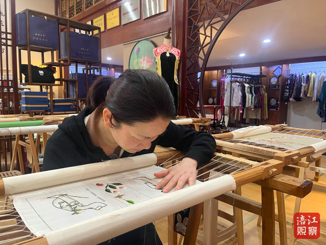 绣架前,学员陈建蓉的身影格外引人注目。她的右眼失明,左眼视力仅0.1,因此她需要将脸贴近绣布才能辨识针脚。但就在这样的状态下,“李白举杯邀明月”的诗意画卷一针一线地缓缓呈现。