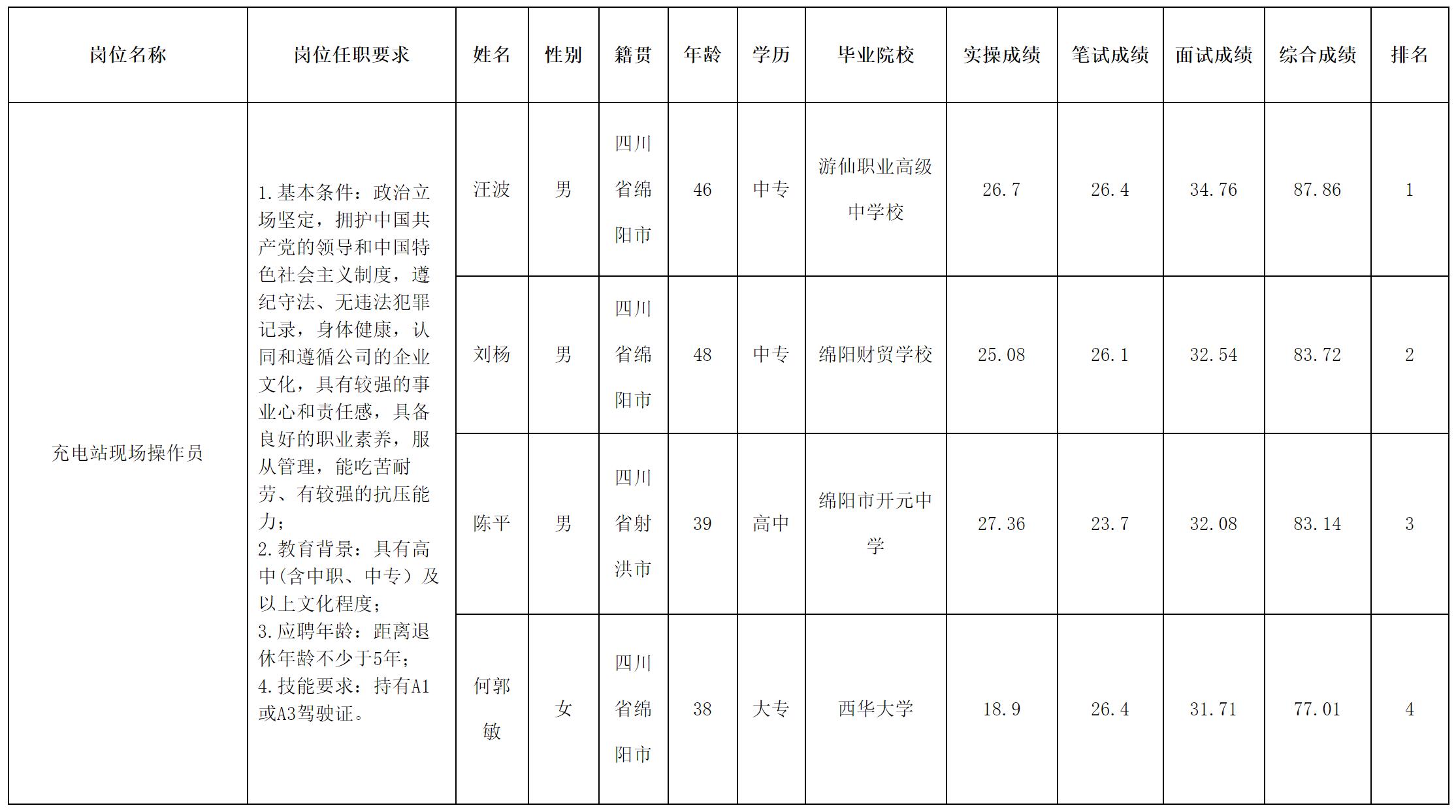 根据绵阳耀鸿交通职业培训有限责任公司发布的招聘公告及招聘相关规定,经实操、笔试等程序,现将实操、笔试(面试)成绩予以公示。