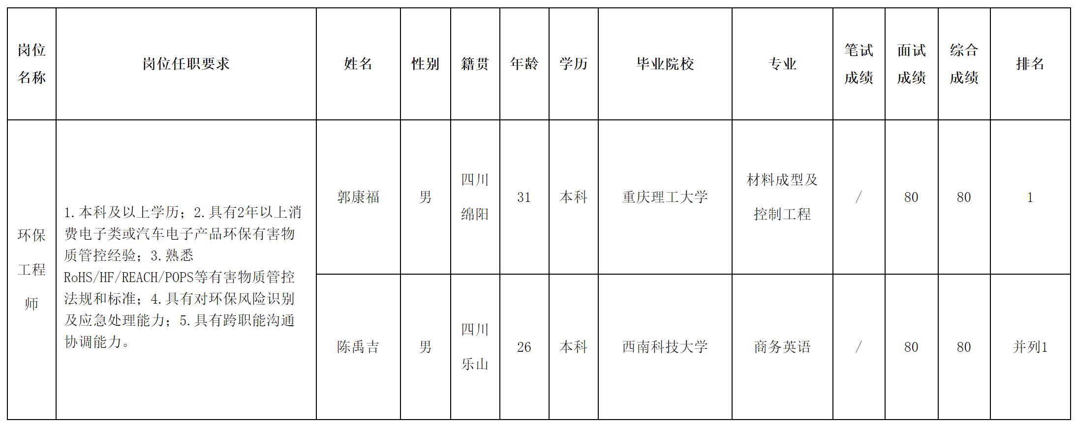 根据四川华丰科技股份有限公司发布的招聘公告及招聘相关规定,经笔试、面试等程序,现将测试成绩予以公示。