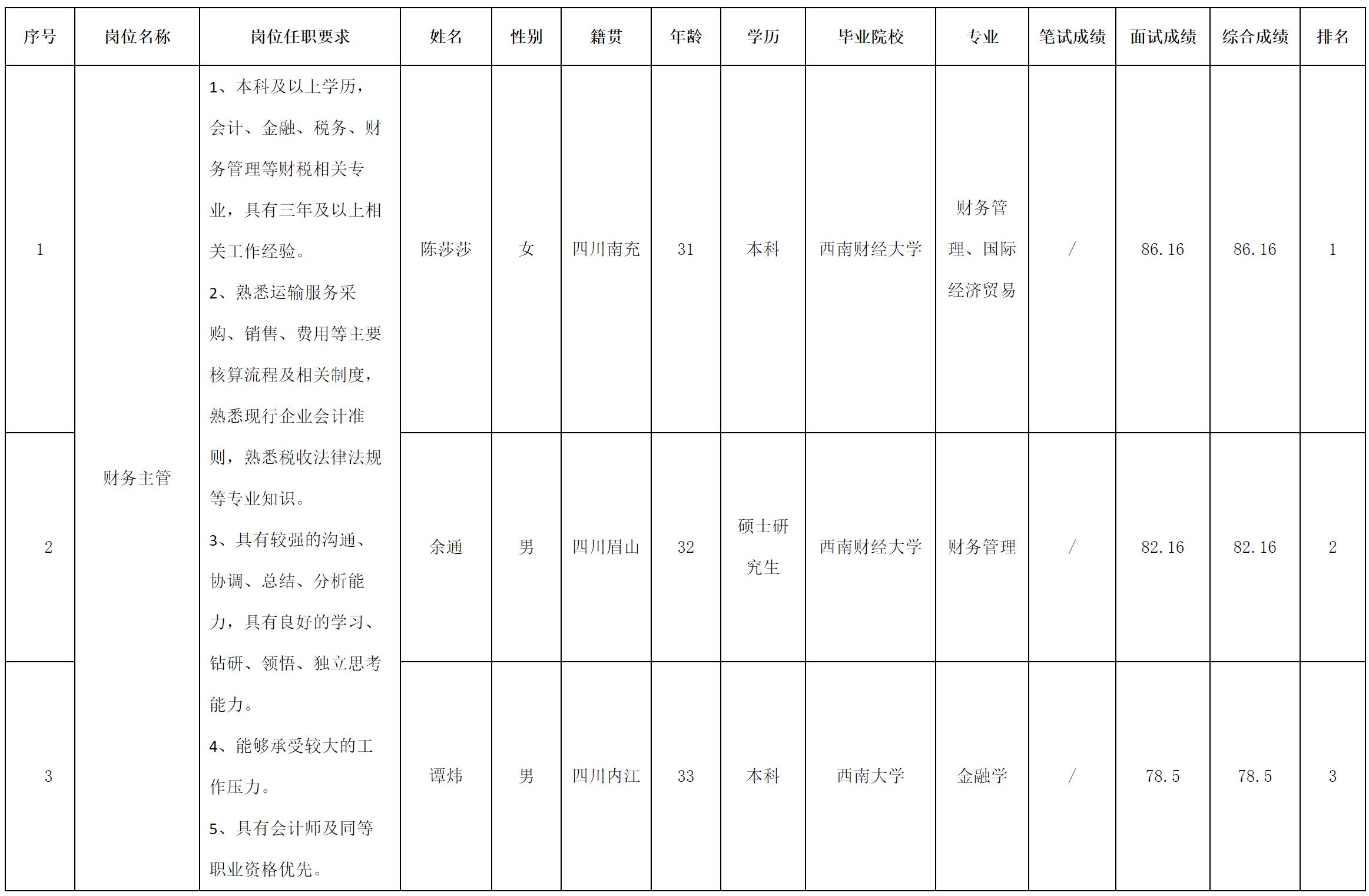 根据四川长虹民生物流股份有限公司发布的招聘公告及招聘相关规定,经面试等程序,现将成绩予以公示。