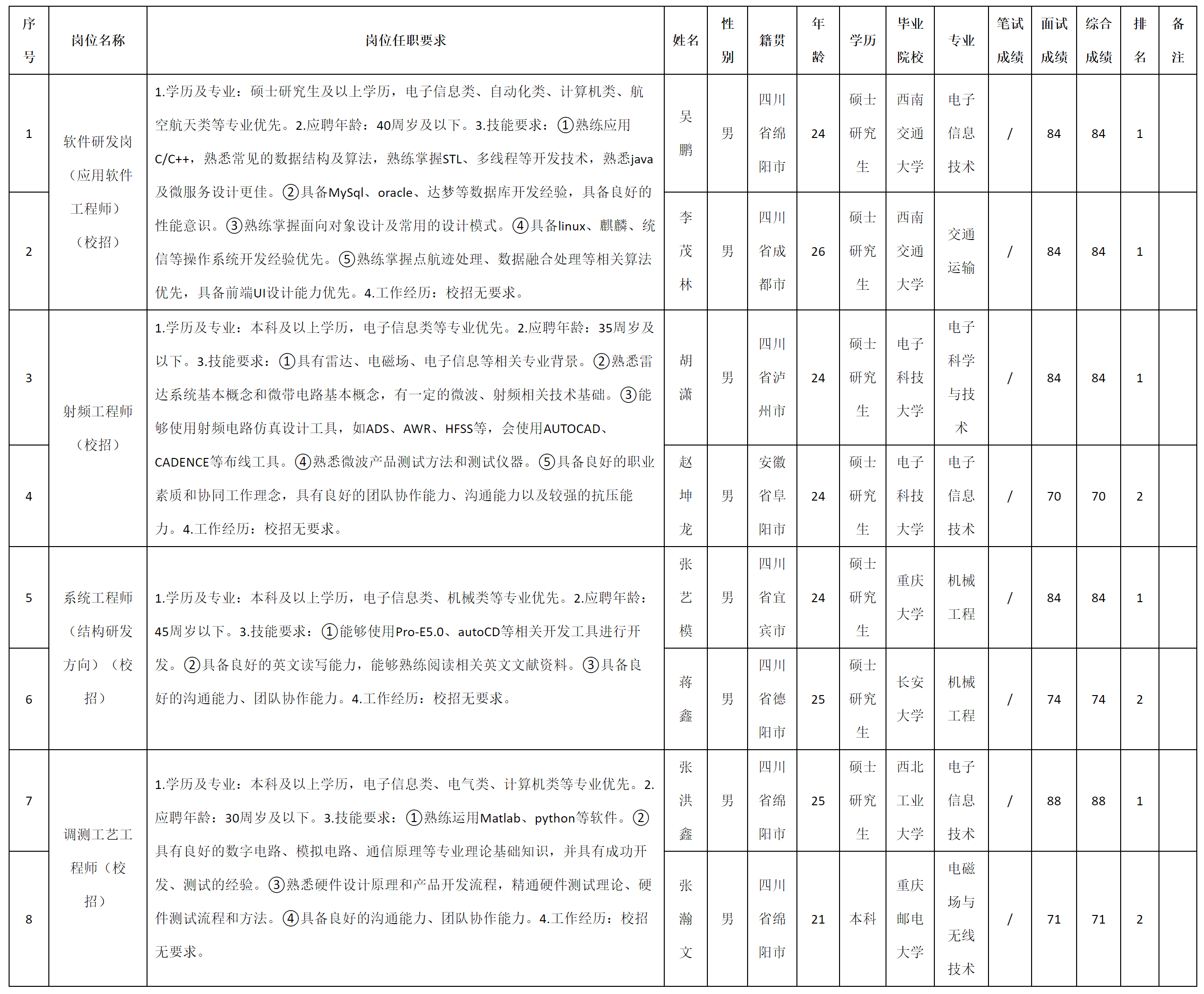 根据四川九洲电器集团有限责任公司发布的招聘公告及招聘相关规定,现将测试成绩予以公示。