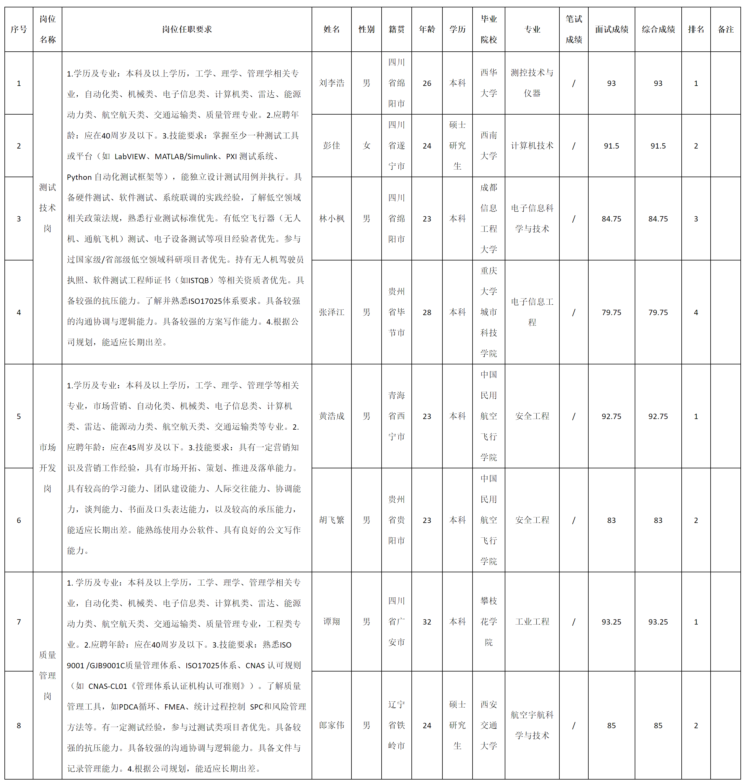 根据四川九洲永昌检测技术服务有限责任公司发布的招聘公告及招聘相关规定,现将测试成绩予以公示。