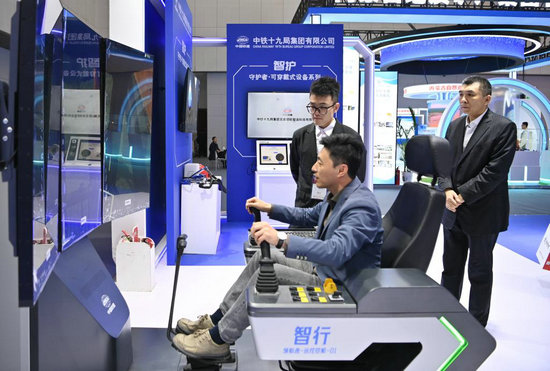 10月23日,参会者在矿山机械装备博览会上体验远控挖机。新华社记者 李然 摄