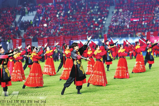 从开场表演《郪风唐韵》,“凤凰于飞”灯光秀光影流转,凤翼翩然,到充满青春气息的团体操,两地文化符号轮番上演,将古风古韵与团结热烈的氛围拉满。