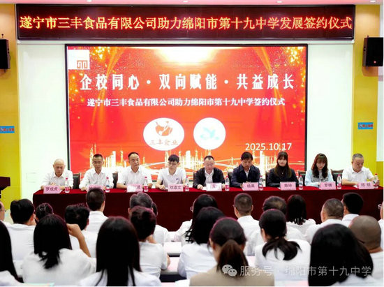 “感恩教育、反哺社会,是企业发展的初心与使命。”遂宁市三丰食品有限公司怀揣社会责任躬身入局,为教育发展增添民生温度。遂宁市三丰食品有限公司董事长邓添文在发言中,道出了企业参与教育公益的深层逻辑。此次合作中,三丰食品不仅为绵阳十九中设立 “奖学金、助学金、奖教金”,捐赠教学物资,为学子成长筑梦、为教师发展赋能,更创新性地提出 “校企互促、共生共赢” 的合作理念,计划依托绵阳十九中及英才学校的教育资源,为企业员工提供文化素养提升、家庭教育指导等服务,将企业社会责任从 “单向的教育捐赠” 升级为 “校企双向赋能” 的可持续模式。