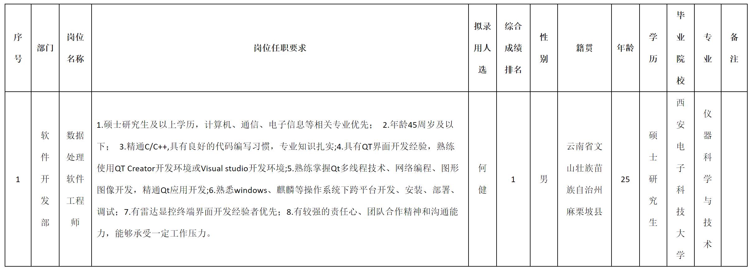 根据四川九洲防控科技有限责任公司发布的招聘公告及招聘相关规定,经测试、考察、体检等程序,拟录用何健同志到四川九洲防控科技有限责任公司工作,现予以公示,具体情况如下: