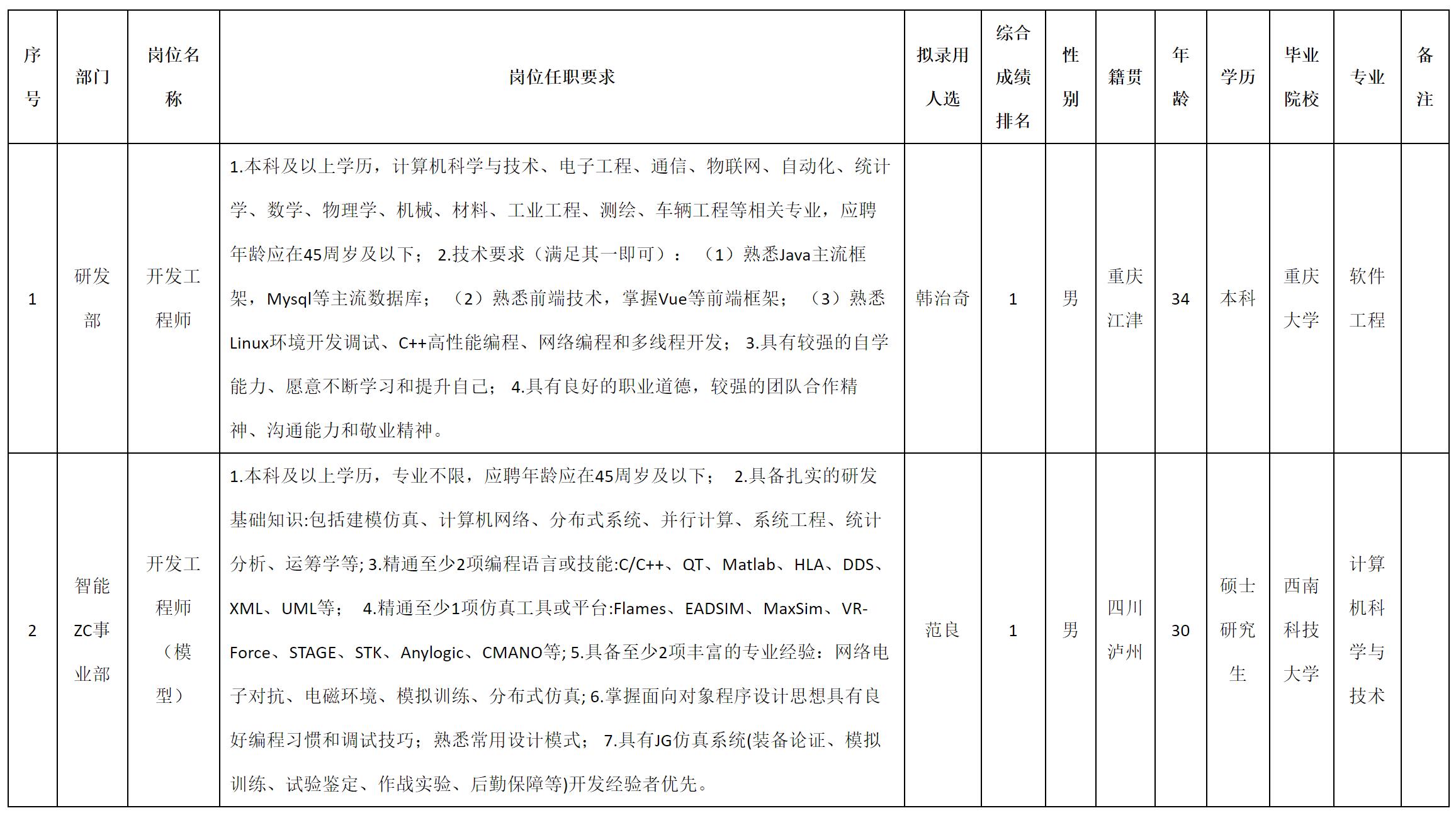 根据四川九洲投资控股集团有限公司软件与数据智能军团发布的招聘公告及招聘相关规定,经测试、考察、体检等程序,拟录用韩治奇等2名同志到四川九洲投资控股集团有限公司软件与数据智能军团工作,现予以公示,具体情况如下: