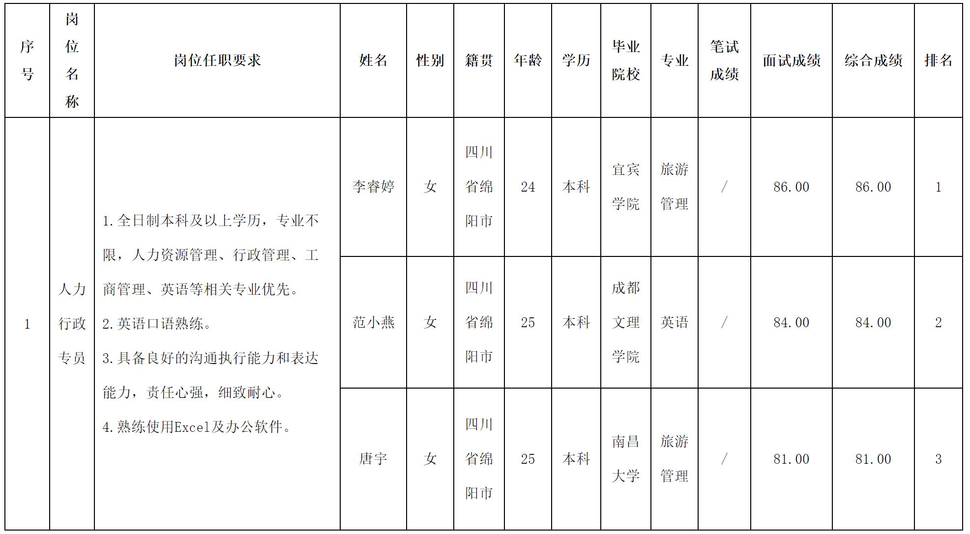 根据四川波鸿实业有限公司发布的招聘公告及招聘相关规定,现将测试成绩予以公示。