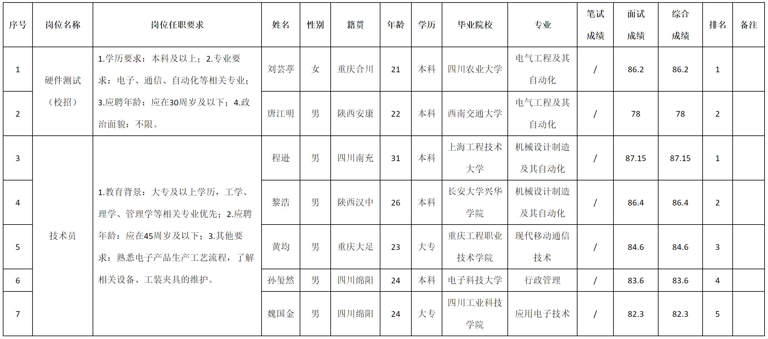 根据四川九州电子科技股份有限公司发布的招聘公告及招聘相关规定,现将测试成绩予以公示。