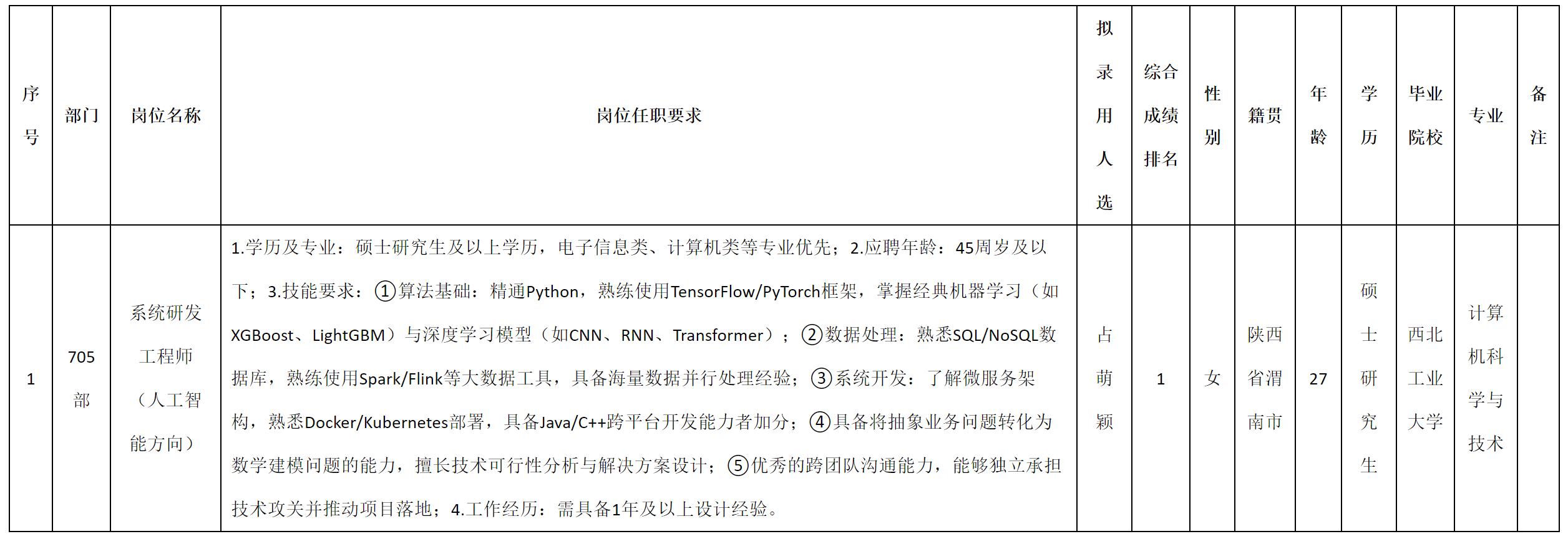 根据四川九洲电器集团有限责任公司发布的招聘公告及招聘相关规定,经测试、考察、体检等程序,拟录用占萌颖同志到四川九洲电器集团有限责任公司工作,现予以公示,具体情况如下: