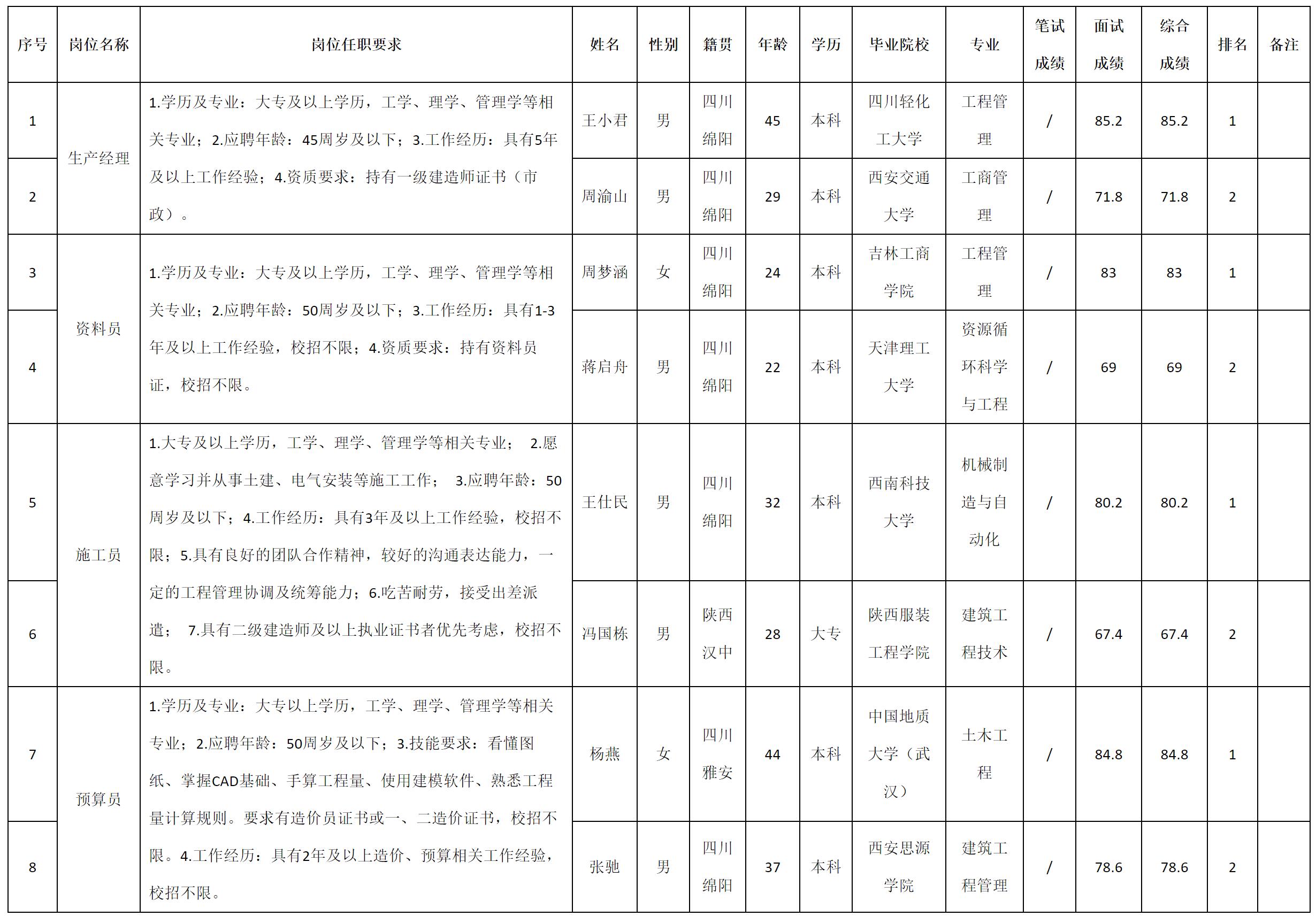 根据四川九洲建筑工程有限责任公司发布的招聘公告及招聘相关规定,现将测试成绩予以公示。