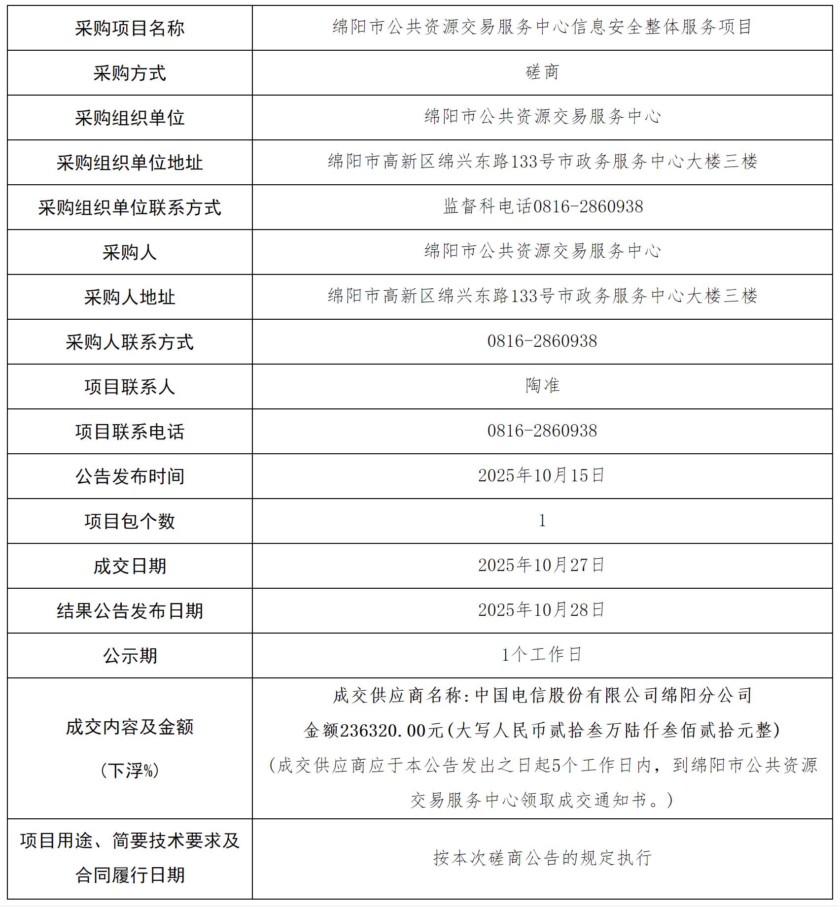 绵阳市公共资源交易服务中心关于“信息安全整体服务”项目采购结果的公告