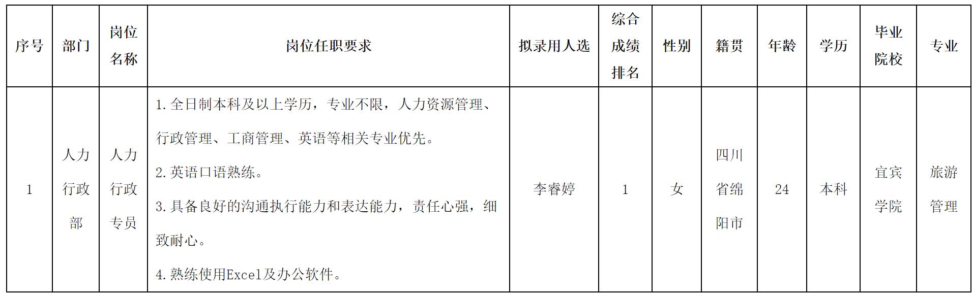 根据四川波鸿实业有限公司发布的招聘公告及招聘相关规定,经面试、体检等程序,拟录用李睿婷同志到威斯卡特(绵阳)汽车零部件制造有限公司工作,现予以公示,具体情况如下: