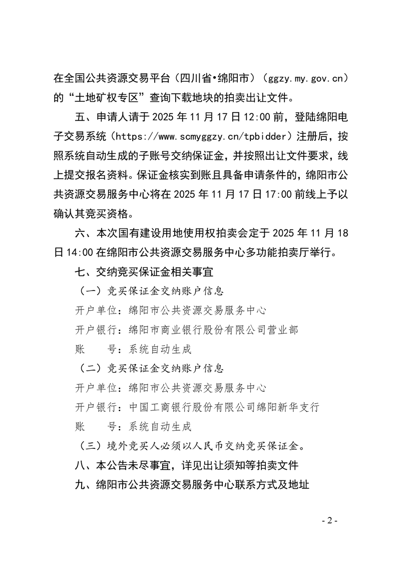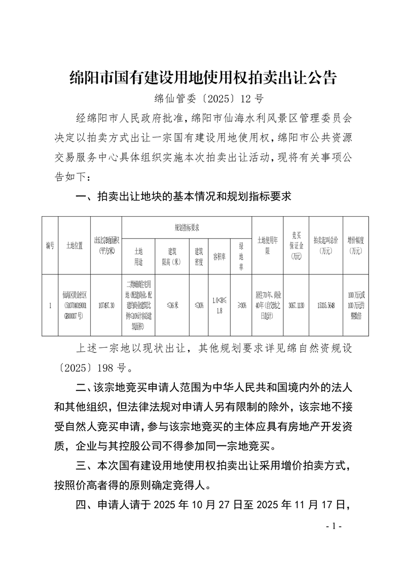 绵阳市国有建设用地使用权拍卖出让公告(绵仙管委〔2025〕12号)