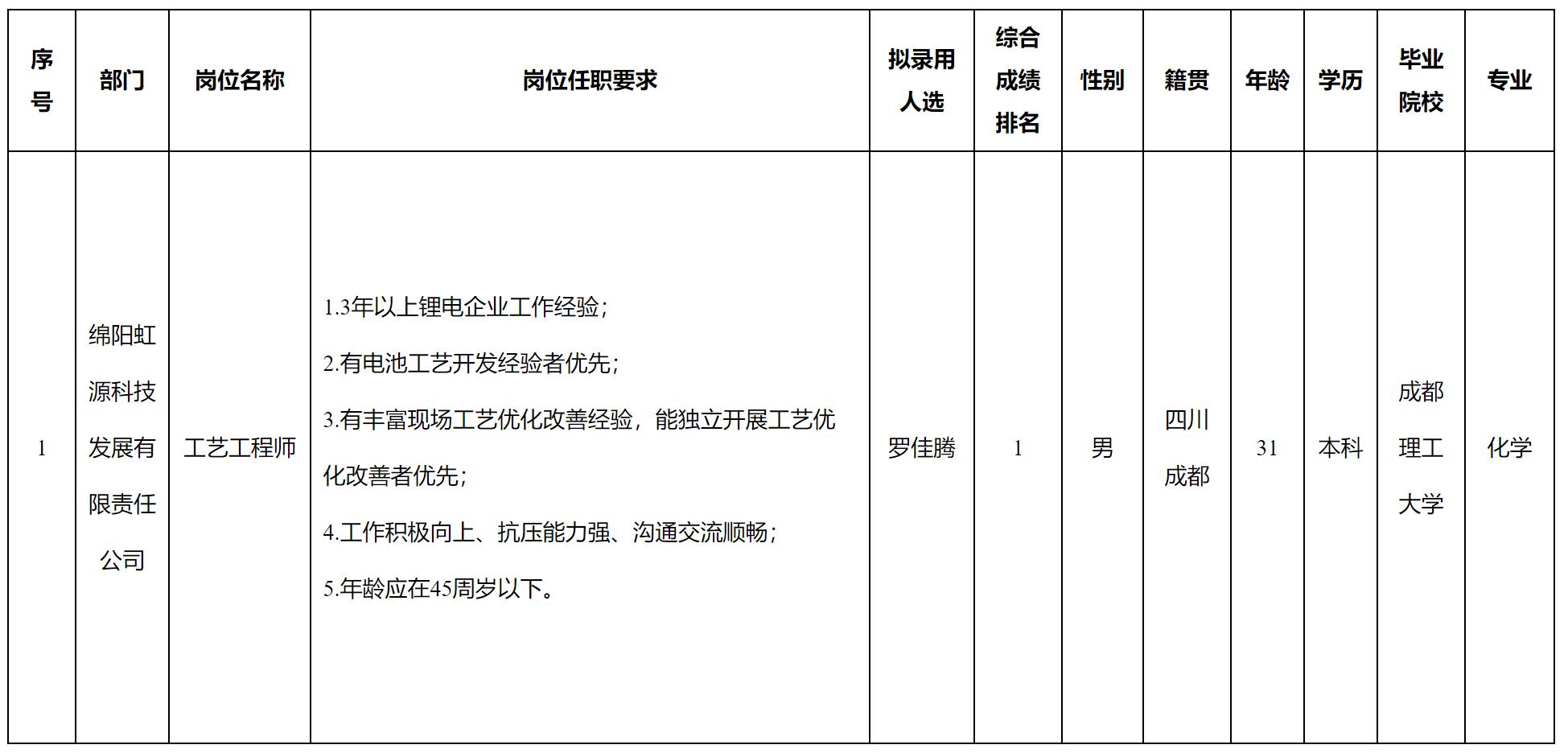 根据绵阳虹源科技发展有限责任公司发布的招聘公告及招聘相关规定,经面试、考察、体检等程序,拟录用罗佳腾同志到我司工作,现予以公示,具体情况如下: