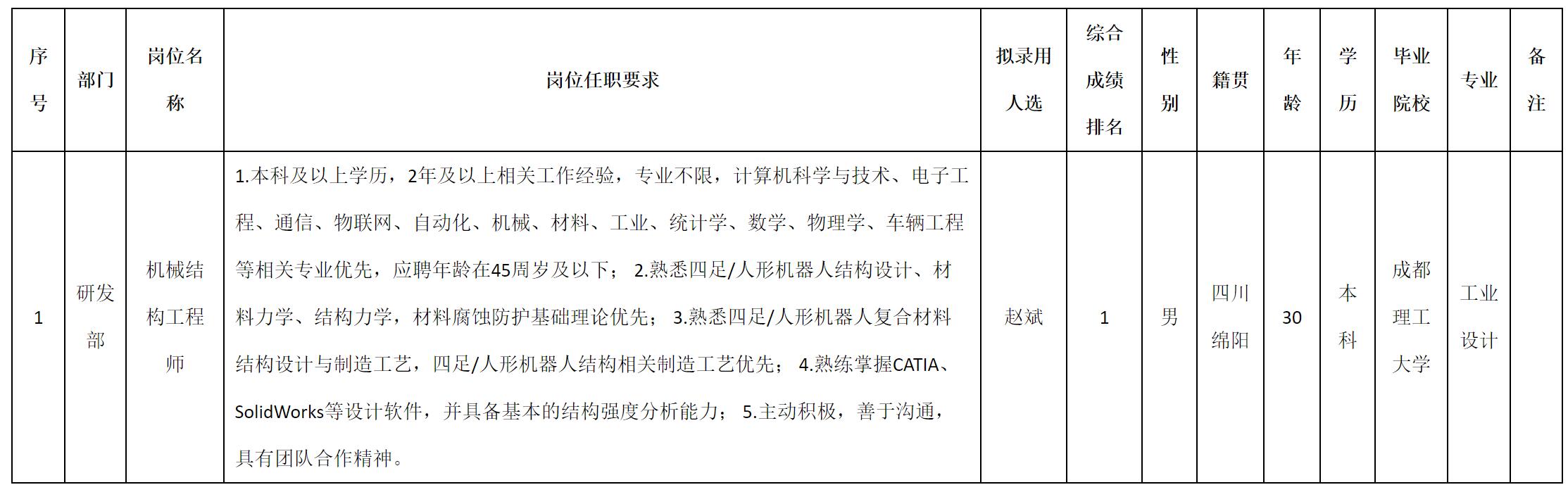 根据四川九洲投资控股集团有限公司软件与数据智能军团发布的招聘公告及招聘相关规定,经测试、考察、体检等程序,拟录用赵斌同志到四川九洲投资控股集团有限公司软件与数据智能军团工作,现予以公示,具体情况如下: