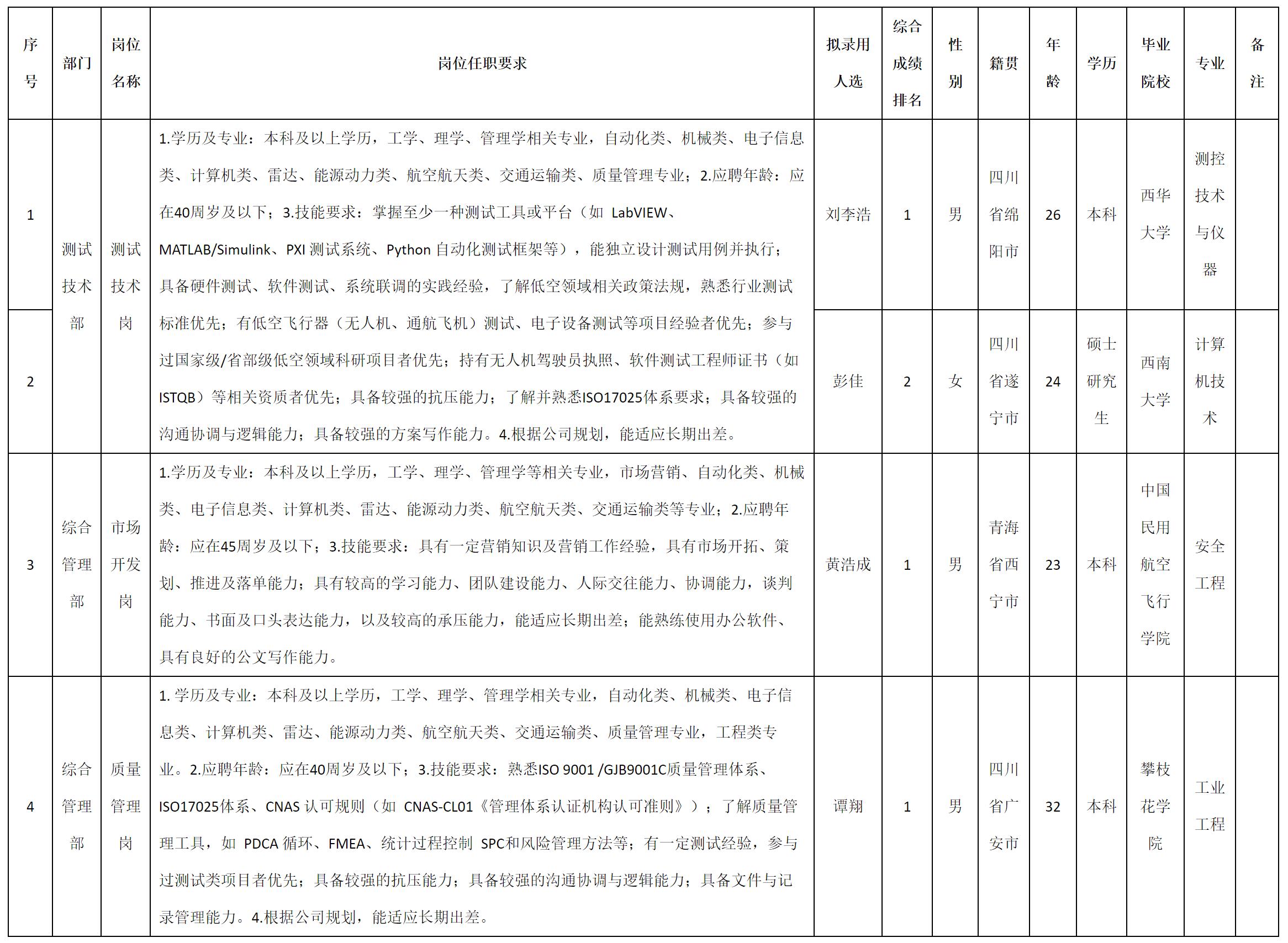 根据四川九洲永昌检测技术服务有限责任公司发布的招聘公告及招聘相关规定,经测试、考察、体检等程序,拟录用刘李浩等4名同志到四川九洲永昌检测技术服务有限责任公司工作,现予以公示,具体情况如下: