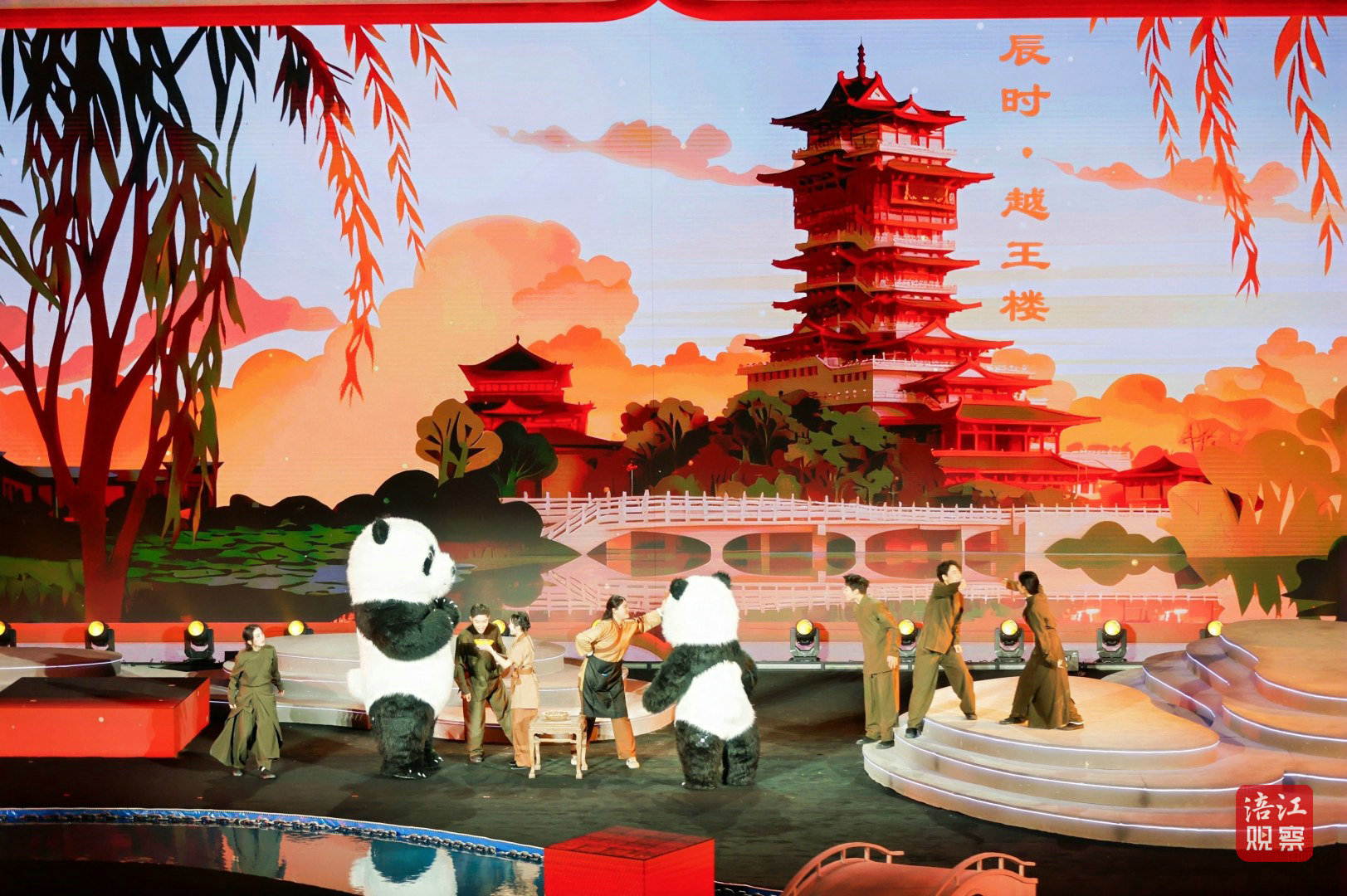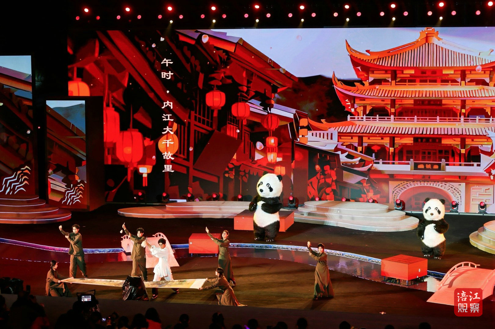 十二时辰走一圈,安逸熊猫、科技熊猫在四川。从辰时绵阳越王楼的巍峨——“辰时登楼望江流,唐代诗篇刻心头。米粉香飘烟火气,文武盛景在绵州”,到卯时巴中达州大巴山的秀美——“卯时大巴山雨晴,云雾缭绕似画屏”,8分钟的演出让观众沉浸式感受四川的文旅魅力。