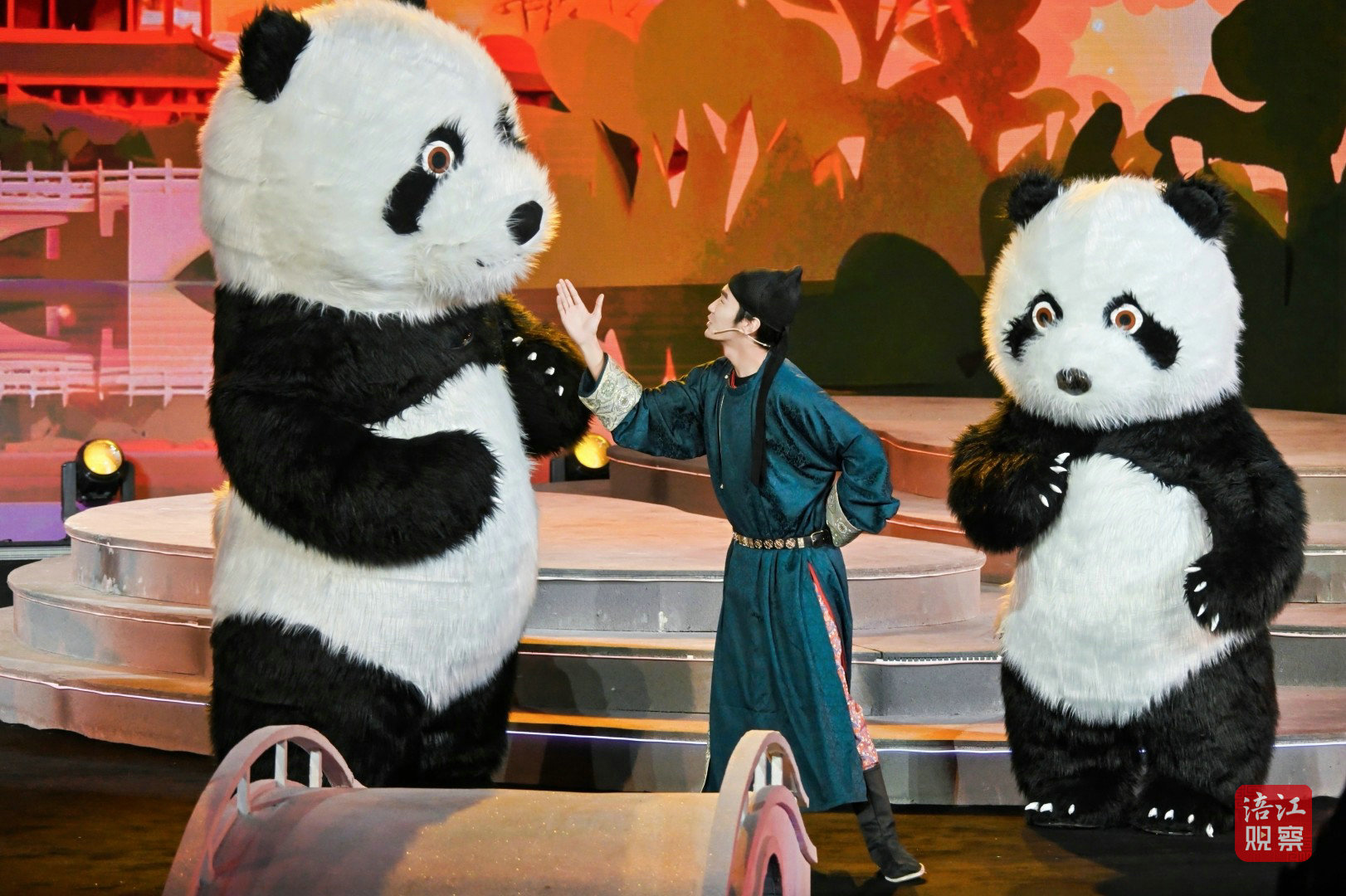 创意舞台秀《天府十二时辰》以十二时辰为轴,带领观众领略四川十二个旅游目的地的独特魅力。说书人袁国虎手持折扇,立于三星堆神树造型的舞台中央,引领两只可爱的熊猫“安逸”和“阳阳”开启时空之旅。