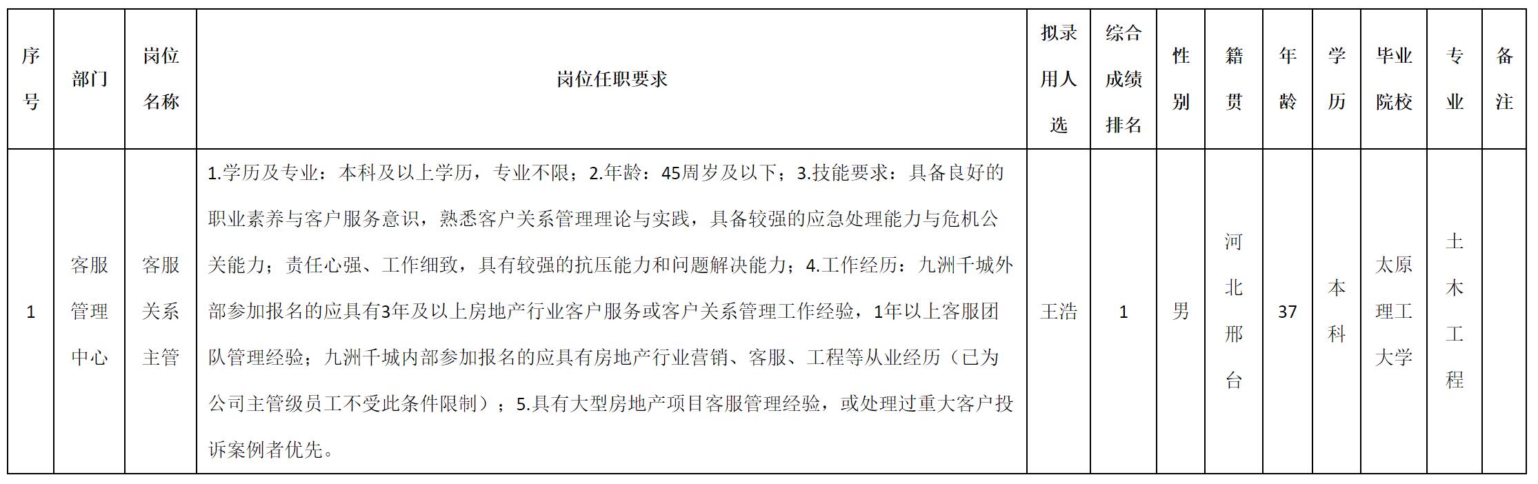 根据九洲千城置业有限责任公司发布的招聘公告及招聘相关规定,经测试、考察、体检等程序,拟录用王浩同志到九洲千城置业有限责任公司工作,现予以公示,具体情况如下: