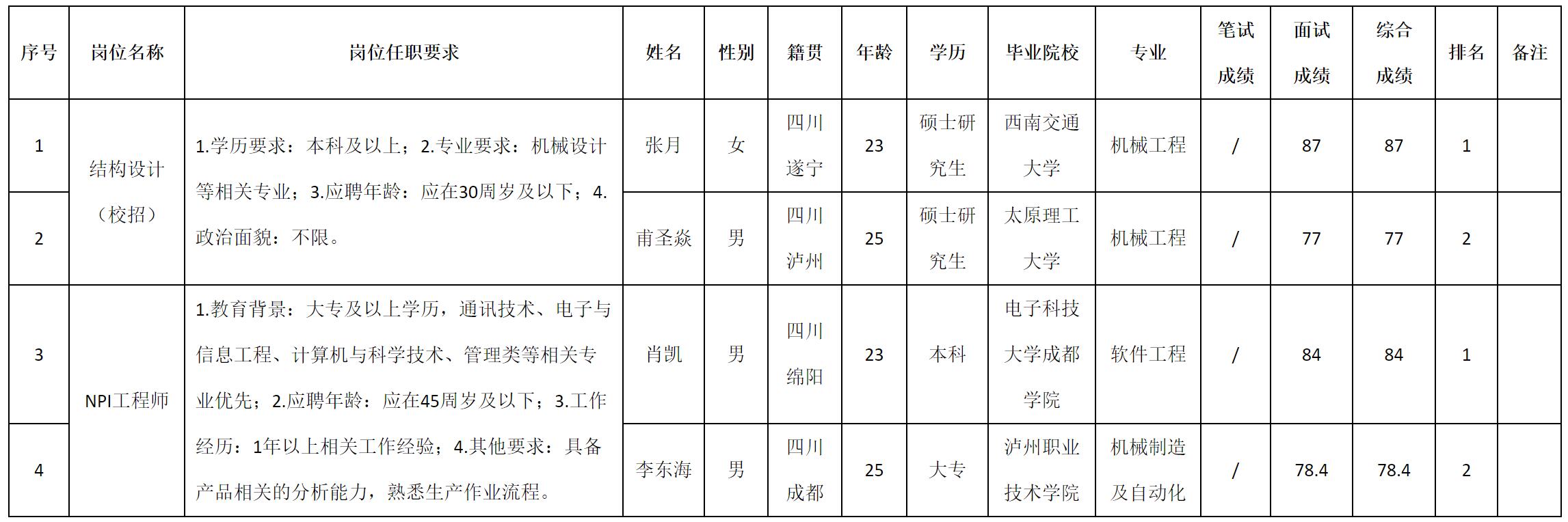 根据四川九州电子科技股份有限公司发布的招聘公告及招聘相关规定,现将测试成绩予以公示。