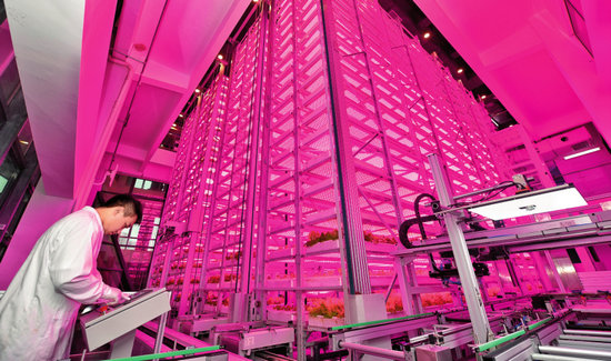 在位于四川天府新区的中国农业科学院都市农业研究所超高层无人化垂直植物工厂内,科技人员在调试软件(2024年10月16日摄)刘坤摄/本刊