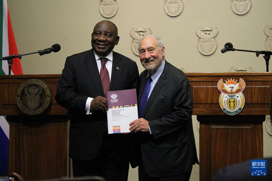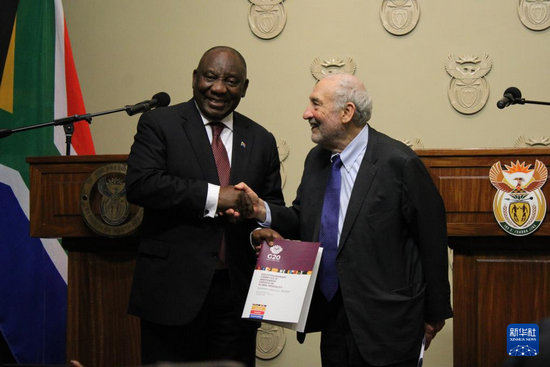 11月4日,在南非立法首都开普敦,二十国集团应对全球不平等问题特别独立专家委员会主席、诺贝尔经济学奖得主约瑟夫·施蒂格利茨(右)向南非总统拉马福萨提交关于全球不平等问题的报告。新华社发(沙姬拉·泰比摄)