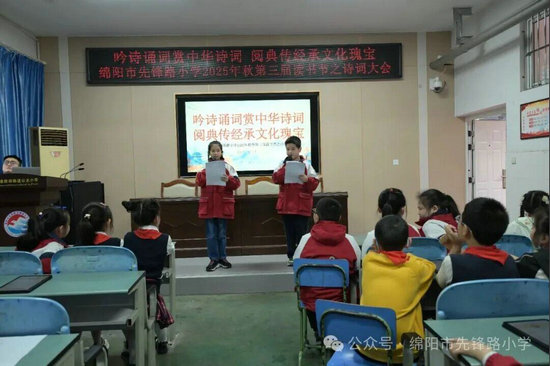 绵阳新闻网讯 11月5日上午,绵阳市先锋路小学在学术厅内举行了以“吟诗诵词品华夏雅韵,阅典传经承文化瑰宝”为主题的2025年秋诗词大赛决赛活动。历经班级初赛的严格选拔,脱颖而出的选手们齐聚一堂,以诗为剑,以词为盾,在决赛舞台上展开一场精彩的诗词较量。