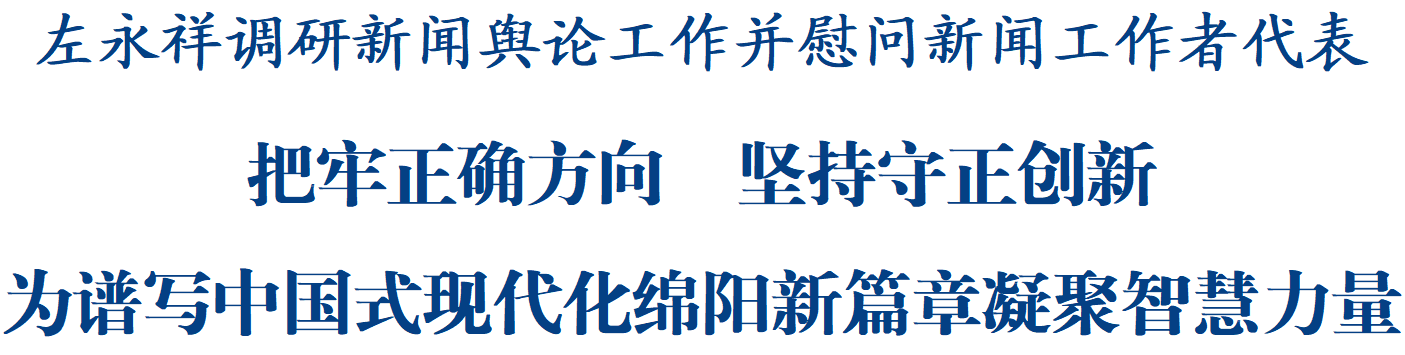 调研中,左永祥代表市委、市政府向全市广大新闻工作者致以节日问候,向大家长期以来的辛勤付出表示感谢,对全市新闻舆论工作取得的成绩给予肯定,并宣讲党的二十届四中全会精神。他指出,学习宣传贯彻党的二十届四中全会精神,是全市上下当前和今后一个时期的重要政治任务,要精心组织传达学习,广泛开展宣传宣讲,着力营造浓厚氛围。面对新形势新任务,新闻媒体要站在巩固党的执政基础、维护意识形态安全、服务绵阳发展大局的高度,在谱写中国式现代化绵阳新篇章进程中展现新担当新作为。要坚持党媒姓党,自觉把拥护“两个确立”、做到“两个维护”落实到新闻舆论工作的各方面全过程,加强思想政治建设,增强政治敏锐性和政治鉴别力,坚决守好意识形态阵地,研究好阐释好传播好新时代党的创新理论,确保新闻舆论工作始终沿着正确方向前进。要围绕全市中心工作,把镜头和笔触聚焦到推动高质量发展生动实践和群众关切的民生实事上来,创作更多贴近时代、贴近群众、贴近生活的精品力作,讲好绵阳故事、传播绵阳声音、展示绵阳形象,巩固壮大全市上下奋进新时代的主流思想舆论。要锐意改革创新,创新数字时代新闻传播手段、方式和载体,积极拓展“新闻+”发展模式,走好新闻媒体赋能文旅深度融合发展路径,激发媒体转型的“内生动力”。要强化人才引领,加强班子队伍建设和人才工作,健全新闻宣传人才培养、使用、激励等机制,提升专业素养能力,着力打造一支政治坚定、业务精湛、作风优良的新闻舆论工作队伍。